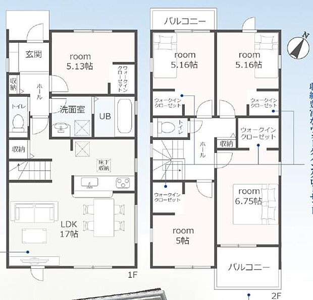 | 間取り | 5LDK 間取り内訳:リビングダイニングキッチン 17帖(1階)・洋室 5.1帖(1階)・洋室 6.7帖(2階)・洋室 5.1帖(2階)・洋室 5.1帖(2階)・洋室 5帖(2階) |