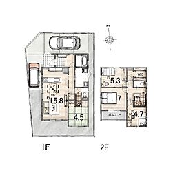 • 3LDK、2階建ての木造です♪リビング横に畳コーナー・2階にウォークインクローゼットがある、家族の使いやすい間取りになっております♪