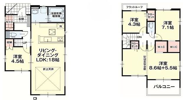 | 間取り | 4LDK 間取り内訳:リビングダイニングキッチン 18帖(1階)・洋室 4.5帖(1階)・洋室 14.1帖(2階)・洋室 7.1帖(2階)・洋室 4.3帖(2階) |