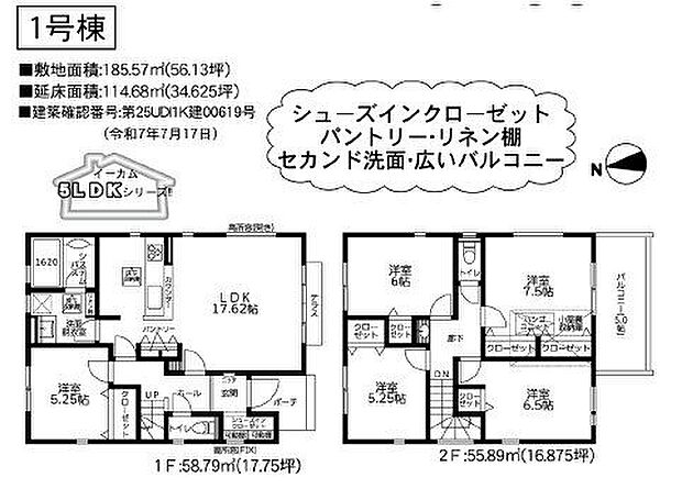 | 間取り | 5LDK 間取り内訳:リビングダイニングキッチン 17.6帖(1階)・洋室 5.2帖(1階)・洋室 6帖(2階)・洋室 5.2帖(2階)・洋室 7.5帖(2階)・洋室 6.5帖(2階) |