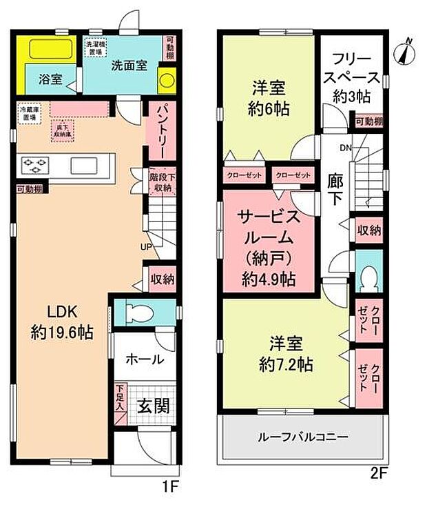 | 間取り | 2SLDK 間取り内訳:リビングダイニングキッチン 19.6帖(1階)・洋室 7.2帖(2階)・洋室 6帖(2階)・収納 4.9帖(2階) |