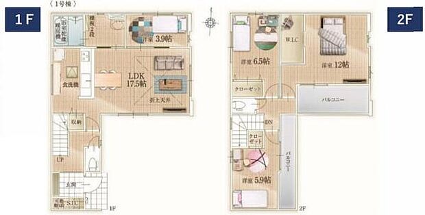 4LDK。LDK広々17.5帖。織り上げ天井採用で解放感あり。南・東2面バルコニー
