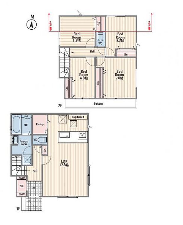 | 間取り | 4LDK 間取り内訳:リビングダイニングキッチン 17.3帖(1階)・洋室 7帖(2階)・洋室 5.3帖(2階)x2・洋室 4.8帖(2階) |