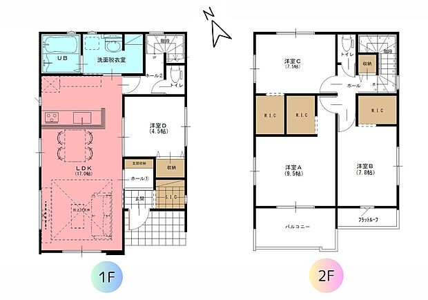| 間取り | 4LDK 間取り内訳:リビングダイニングキッチン 17帖(1階)・洋室 4.5帖(1階)・洋室 7.5帖(2階)・洋室 7.8帖(2階)・洋室 9.5帖(2階) |