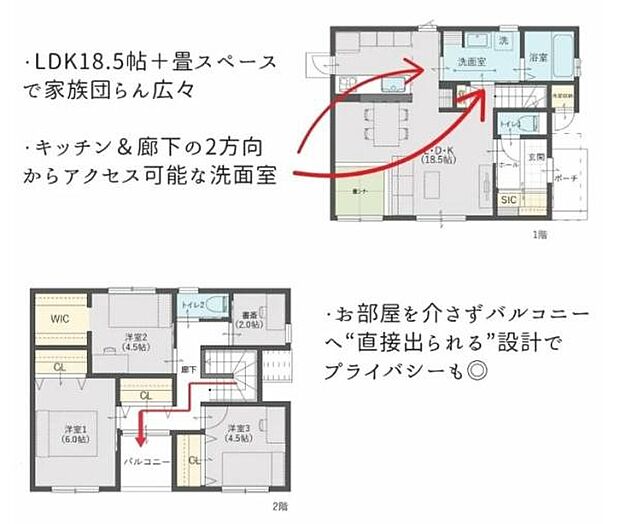 | 間取り | 3SLDK 間取り内訳:リビングダイニングキッチン 18.5帖(1階)・洋室 6帖(2階)・洋室 4.5帖(2階)・洋室 4.5帖(2階)・収納 2帖(2階) |