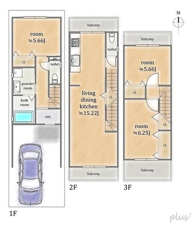 間取り内訳:洋室 5.6帖(1階)・リビングダイニングキッチン 15.2帖(2階)・洋室 6.2帖(3階)・洋室 5.6帖(3階)