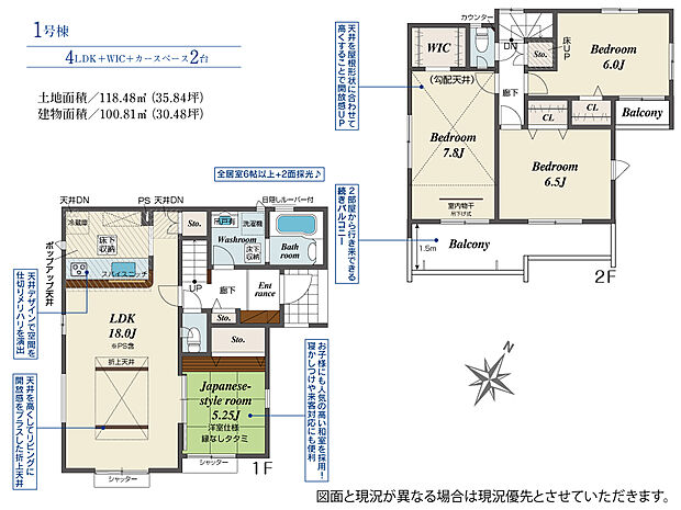 - 「建築条件付き土地」の「建物プラン例」は、土地購入者の設計プランの一例であり、プランの採用可否は任意です。