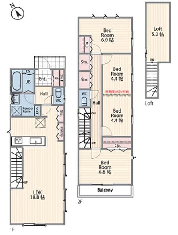 | 間取り | 4LDK 間取り内訳:リビングダイニングキッチン 18.8帖(1階)・洋室 6.8帖(2階)・洋室 6帖(2階)・洋室 4.4帖(2階)・洋室 4.4帖(2階) |