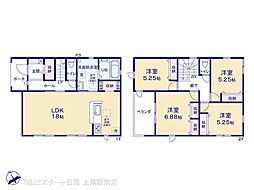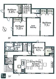 | 間取り | 4LDK 間取り内訳:洋室 7.5帖(2階)・洋室 5.2帖(2階)・洋室 5.2帖(2階)・洋室 4.5帖(1階)・リビングダイニングキッチン 17.7帖(1階) |