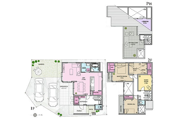 | 間取り | 3SLDK 間取り内訳:リビングダイニングキッチン 21.9帖(1階)・洋室 7.4帖(2階)・洋室 5.3帖(2階)・収納 5.3帖(2階)・洋室 5.1帖(2階) |