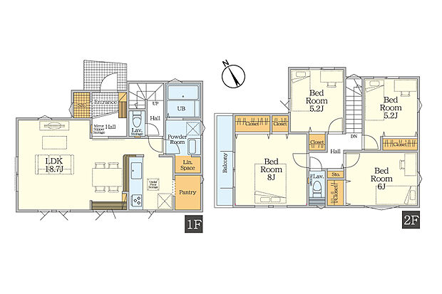 | 間取り | 4LDK 間取り内訳:リビングダイニングキッチン 18.7帖(1階)・洋室 8帖(2階)・洋室 6帖(2階)・洋室 5.2帖(2階)x2 |