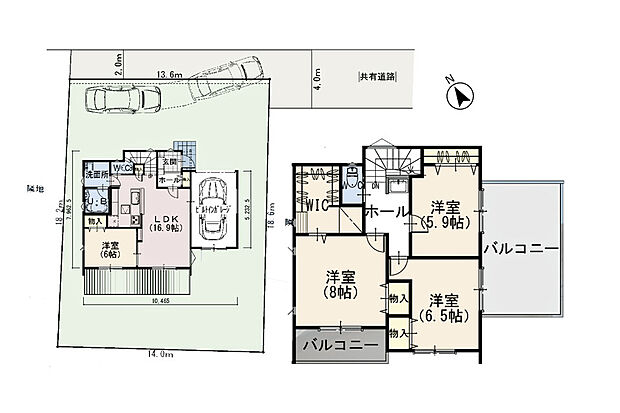 | 間取り | 4LDK 間取り内訳:リビングダイニングキッチン 16.9帖(1階)・洋室 6帖(1階)・洋室 8帖(2階)・洋室 6.5帖(2階)・洋室 5.9帖(2階) |