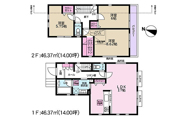 | 間取り | 3LDK 間取り内訳:リビングダイニングキッチン 17帖(1階)・洋室 8.6帖(2階)・洋室 6帖(2階)・洋室 5.7帖(2階) |
