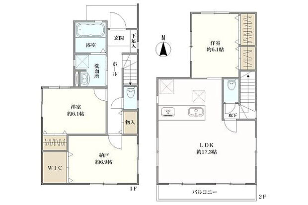 | 間取り | 3LDK 間取り内訳:洋室 6.9帖(1階)・洋室 6.1帖(1階)・リビングダイニングキッチン 17.3帖(2階)・洋室 6.1帖(2階) |