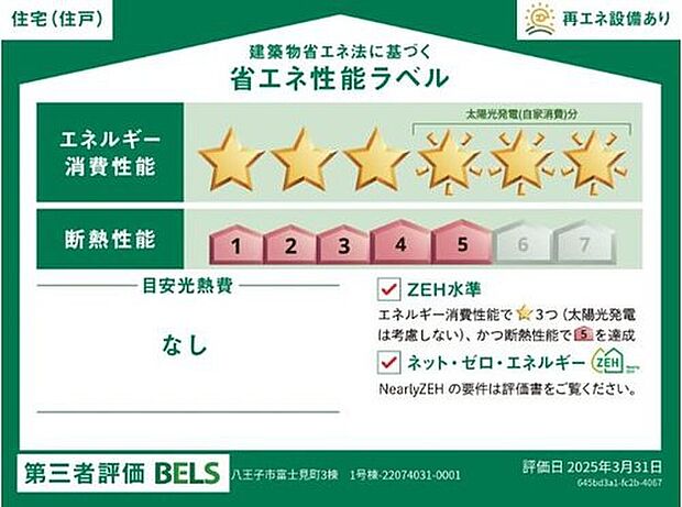 - 星マークの数が多いほどエネルギー消費性能が高いことを示しています。再エネ設備のない住宅は★0~★4の5段階評価、再エネ設備がある住宅は★0~★6の7段階評価となります。