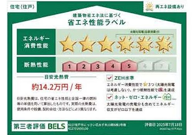 - 星マークの数が多いほどエネルギー消費性能が高いことを示しています。再エネ設備のない住宅は★0~★4の5段階評価、再エネ設備がある住宅は★0~★6の7段階評価となります。