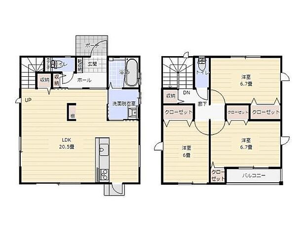 間取り内訳:リビングダイニングキッチン 20.5帖(1階)・洋室 6.7帖(2階)・洋室 6.7帖(2階)・洋室 6帖(2階)