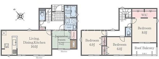 間取り内訳:リビングダイニングキッチン 16帖(1階)・和室 5.2畳(1階)・洋室 8帖(2階)・洋室 6帖(2階)・洋室 6.9帖(2階)