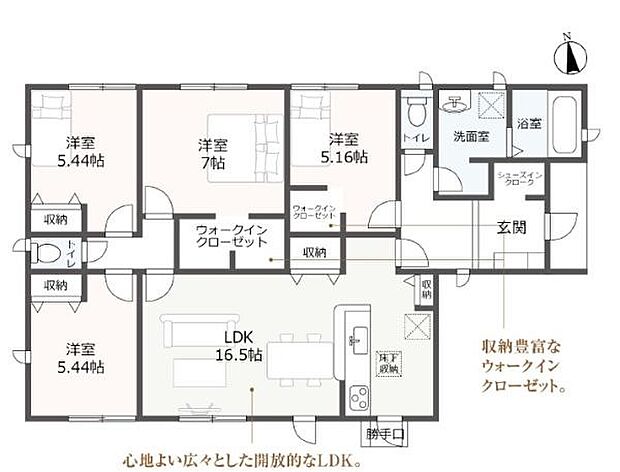 | 間取り | 4LDK 間取り内訳:リビングダイニングキッチン 16.5帖(1階)・洋室 7帖(1階)・洋室 5.4帖(1階)・洋室 5.4帖(2階)・洋室 5.1帖(2階) |