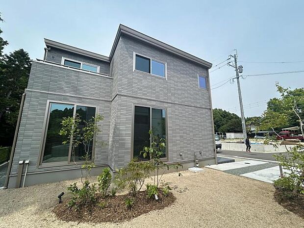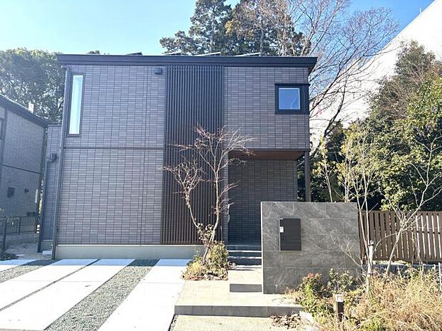 • 【外観【2号地】(2025年8月撮影)】自然豊かな周辺環境に溶け込むタイル外壁と化粧格子の組み合わせ