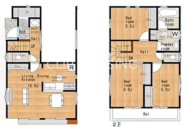 | 間取り | 3LDK 間取り内訳:リビングダイニングキッチン 15帖(1階)・洋室 6帖(2階)・洋室 5.3帖(2階)・洋室 5帖(2階) |