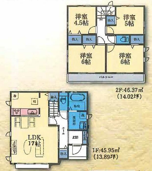 | 間取り | 4LDK 間取り内訳:リビングダイニングキッチン 17帖(1階)・洋室 6帖(2階)x2・洋室 5帖(2階)・洋室 4.5帖(2階) |