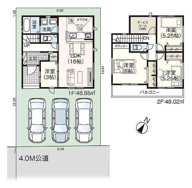 | 間取り | 4SLDK 間取り内訳:洋室 8帖(2階)・洋室 5.2帖(2階)・洋室 5.2帖(2階)・洋室 3帖(1階)・リビングダイニングキッチン 16帖(1階)・収納 3帖(2階) |