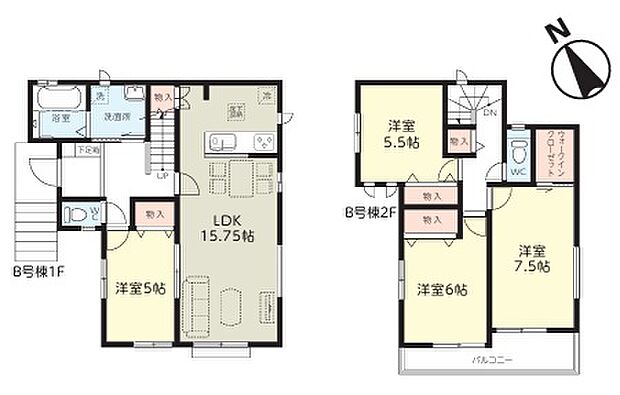 | 間取り | 4LDK 間取り内訳:リビングダイニングキッチン 15.7帖(1階)・洋室 5帖(1階)・洋室 7.5帖(2階)・洋室 6帖(2階)・洋室 5.5帖(2階) |