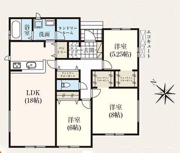 | 間取り | 3LDK 間取り内訳:リビングダイニングキッチン 18帖(1階)・洋室 8帖(1階)・洋室 6帖(1階)・洋室 5.2帖(1階) |