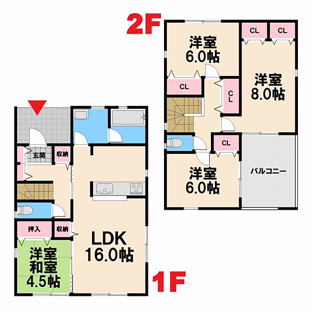 間取り内訳:リビングダイニングキッチン 16帖(1階)・和室 4.5畳(1階)・洋室 8帖(2階)・洋室 6帖(2階)x2