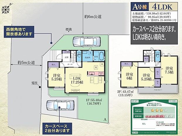 南西向き道路の角地につき陽当り・通風感良好で開放感があります♪ 住宅性能等級7項目で最も高い等級を取得! 家族でくつろげるお庭もございます♪