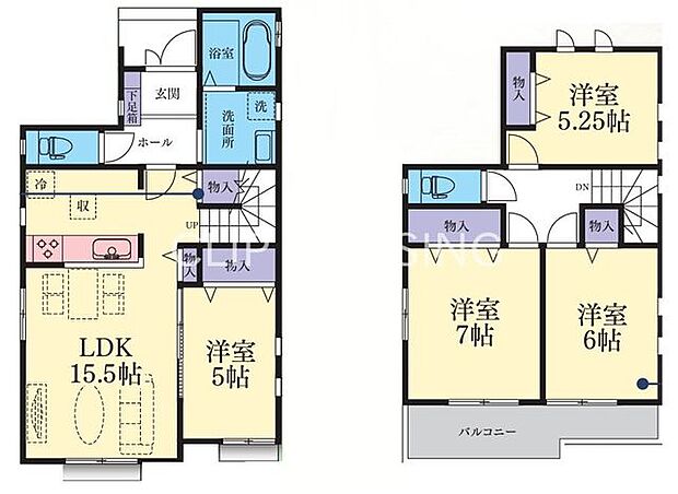 | 間取り | 4LDK 間取り内訳:リビングダイニングキッチン 15.5帖(1階)・洋室 5帖(1階)・洋室 7帖(2階)・洋室 6帖(2階)・洋室 5.2帖(2階) |