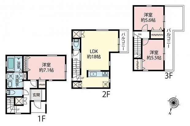 | 間取り | 3LDK 間取り内訳:洋室 7.1帖(1階)・リビングダイニングキッチン 18帖(2階)・洋室 5.6帖(3階)・洋室 5.5帖(3階) |