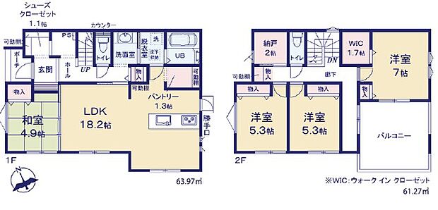 広々としたLDK18.2帖♪ 収納豊富!WIC・シューズクローク・キッチンパントリー1.3帖+2帖の納戸あり♪ 土地も広々49坪超♪カースペース並列2台駐車可(車種による)♪