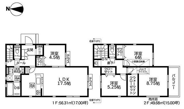 | 間取り | 4LDK 間取り内訳:リビングダイニングキッチン 17.5帖(1階)・洋室 4.5帖(1階)・洋室 8.7帖(2階)・洋室 5.2帖(2階)・洋室 6帖(2階) |