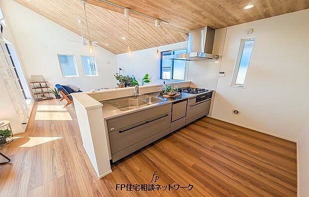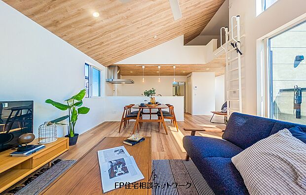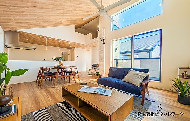 制震装置MAMORY(マモリー)を採用した住宅。繰り返す余震にも効果を発揮します。 ロフトにつながる勾配天井のリビング。シーリングファンと大開口サッシを採用した高天井の開放的なリビングで心地よく寛げます。 住まいと自然が調和する緑豊かな外構。窓からシンボルツリーを眺められる設計です。