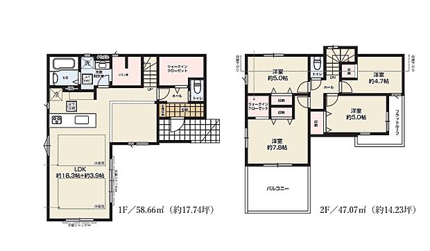 | 間取り | 4SLDK 間取り内訳:リビングダイニングキッチン 22.2帖(1階)・洋室 7.8帖(2階)・洋室 5帖(2階)・洋室 5帖(2階)・洋室 4.7帖(2階) |