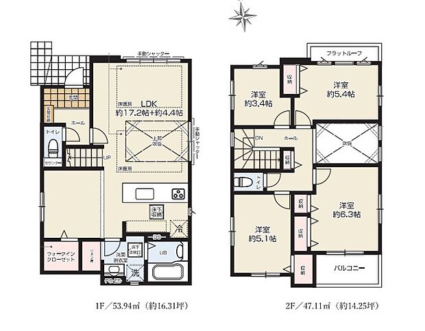 | 間取り | 4LDK 間取り内訳:リビングダイニングキッチン 21.6帖(1階)・洋室 6.3帖(2階)・洋室 5.4帖(2階)・洋室 5.1帖(2階)・洋室 3.4帖(2階) |