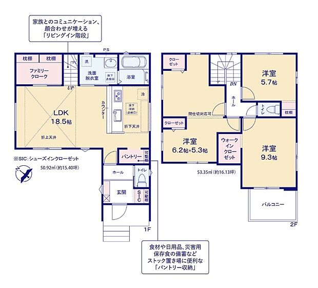| 間取り | 3LDK(ファミリークローク) 間取り内訳:リビングダイニングキッチン 18.5帖(1階)・洋室 12.5帖(2階)・洋室 9.3帖(2階)・洋室 5.7帖(2階) |