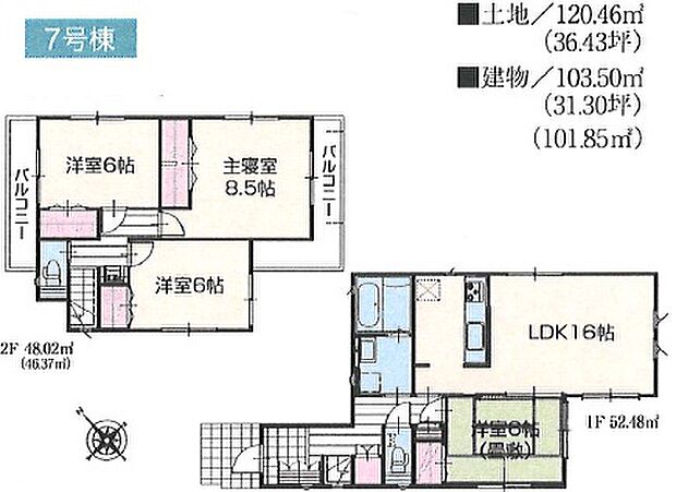 | 間取り | 4LDK 間取り内訳:リビングダイニングキッチン 16帖(1階)・洋室 6帖(1階)・洋室 8.5帖(2階)・洋室 6帖(2階)x2 |