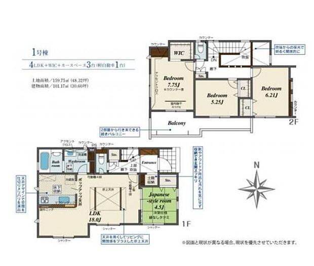 | 間取り | 4LDK 間取り内訳:リビングダイニングキッチン 18帖(1階)・和室 4.5畳(1階)・洋室 7.7帖(2階)・洋室 6.2帖(2階)・洋室 5.2帖(2階) |