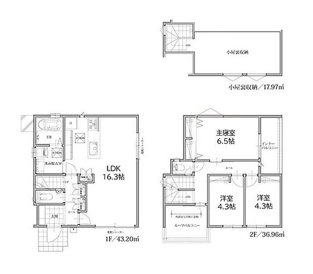 間取り内訳:リビングダイニングキッチン 16.3帖・洋室 6.5帖・洋室 4.3帖