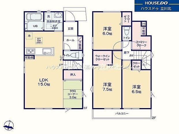 間取り内訳:リビングダイニングキッチン 15帖(1階)・和室 3畳(1階)・洋室 6帖(2階)・洋室 7.5帖(2階)・洋室 6.5帖(2階)