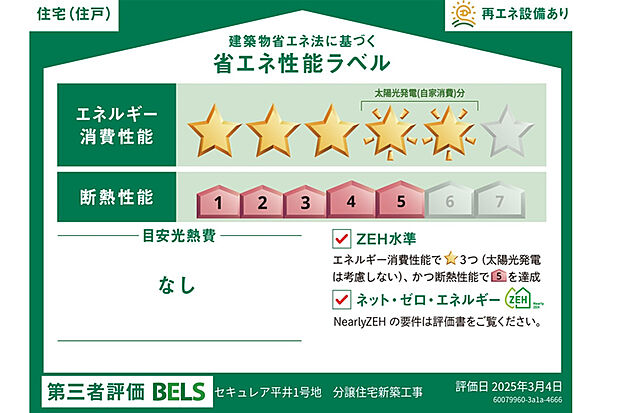- 星マークの数が多いほどエネルギー消費性能が高いことを示しています。再エネ設備のない住宅は★0~★4の5段階評価、再エネ設備がある住宅は★0~★6の7段階評価となります。
