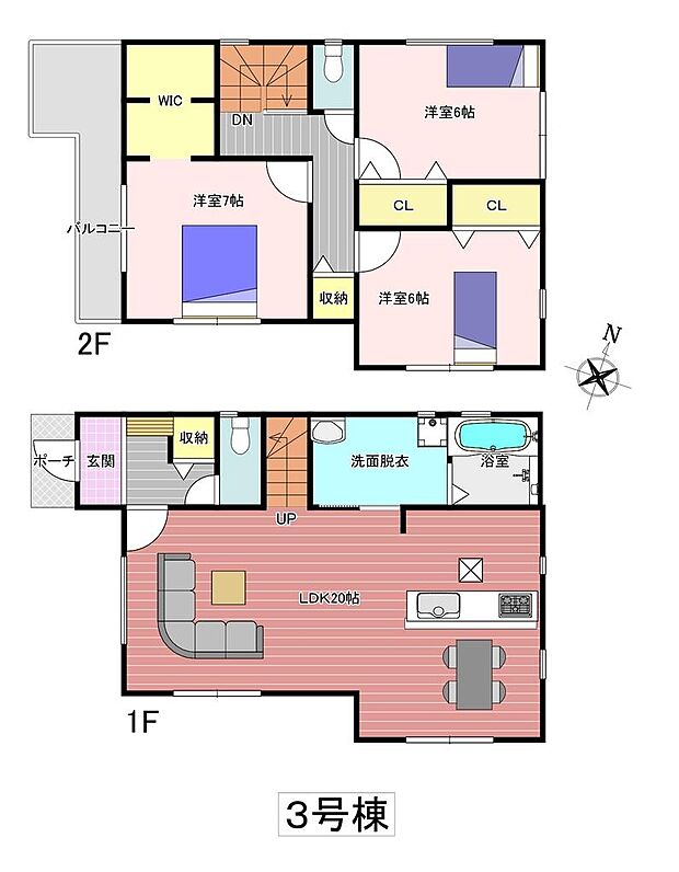| 間取り | 3LDK 間取り内訳:洋室 6帖(2階)・洋室 7帖(2階)・リビングダイニングキッチン 20帖(1階)・洋室 6帖(2階) |