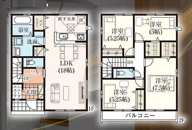 | 間取り | 4LDK 間取り内訳:リビングダイニングキッチン 18帖(1階)・洋室 7.5帖(2階)・洋室 5.2帖(2階)・洋室 5.2帖(2階)・洋室 5帖(2階) |
