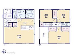間取り内訳:リビングダイニングキッチン 18帖(1階)・洋室 8帖(2階)・洋室 5帖(2階)・洋室 4.5帖(2階)