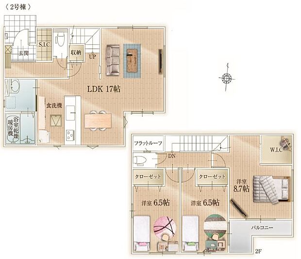 | 間取り | 3LDK 間取り内訳:洋室 8.7帖(2階)・洋室 6.5帖(2階)・洋室 6.5帖(2階)・リビングダイニングキッチン 17帖(1階) |