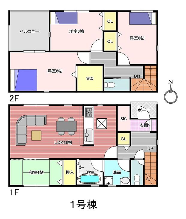 | 間取り | 4LDK 間取り内訳:洋室 6帖(2階)・洋室 6帖(2階)・洋室 8帖(2階)・リビングダイニングキッチン 16帖(1階)・和室 4畳(1階) |