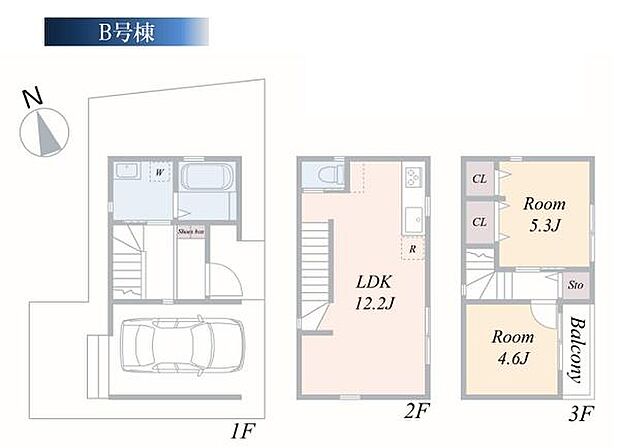 | 間取り | 2LDK 間取り内訳:リビングダイニングキッチン 12.2帖(2階)・洋室 5.3帖(3階)・洋室 4.6帖(3階) |